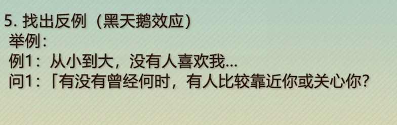 定义:寻找反例,就是证明这一个长期、自动化的不合理想法是无效论证的方法。从日常生活的角度来说,反例的存在就是告诉我们:长久以来自以为是的推理其实是错的,又称为“黑天鹅效应”。(像焦点解决里的例外问句)