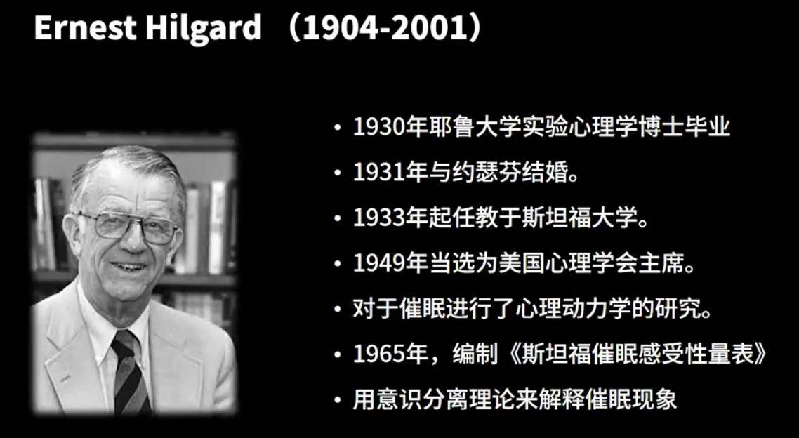 1933年耶鲁大学心理学博士学位 1940年斯福坦大学医学博士学位........这么牛的一个人,终身致力于催眠研究,你就说催眠有多大的魅力,所以如果你还认为说催眠只是一些江湖术士在做的事情,那只是我们孤陋寡闻而已,这都是最顶级的人在做研究,好了,希尔加德的姓很特别,我们跟Ernest Hilgard 联系一下,Ernest Hilgard 我们前面讲过,做分离理论的那个人对吧,那也是斯坦福的教授,他们都是斯坦福的,斯坦福出专业的催眠研究者,所以你要不是斯坦福的,你都不好意思说自己做催眠研究,否则他没有资格,这么牛逼的人才能做,好了,我们看一下,