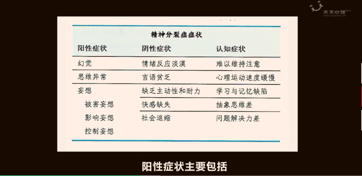 包括社会退、情感缺乏、动机不足等等,最后一类症状叫认知症状,指的是认知困难,比如说学习与记忆困难抽象思维能力差解决问题能力差等等,好,在这张表又给大家再次总结整理了一下。阳性症状包括哪些?阴性症状包括哪些?还有认知症状包括哪些?我带着大家再看一遍,阳性症状主要包括幻觉思维异常胡妄想,阴性症状主要包括