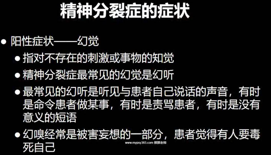情绪反应淡漠、语言贫乏,缺乏主动性和耐力,快感缺失以及社会退缩,认知症状,主要包括难以维持注意,心理运动速度缓慢,学习与记忆缺陷,抽象思维差问题解决能力差,接下来给大家对每一个症状进行详解。阳性症状里面首先一个幻觉,幻觉指什么呢?指的是对不存在的刺激或事物的知觉,