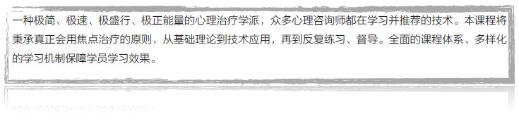是这样的,SFBT是一种简单快速解决心理困扰的治疗方式,因为我们是全程四阶段封闭训练,不仅包含了初阶、进阶课程,领域焦点解决的基本精神及技术要领,还专门分别涉及到焦点解决在家庭咨询、青少年及危机干预中的应用,几乎涵盖了所有常见的咨询领域。另外,这确实是一种放之四海而皆准的咨询方式,只要你勤学苦练,不断充实自己,就可以用焦点解决取向来做所有类型的个案。