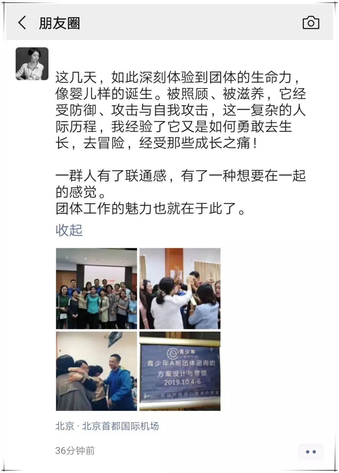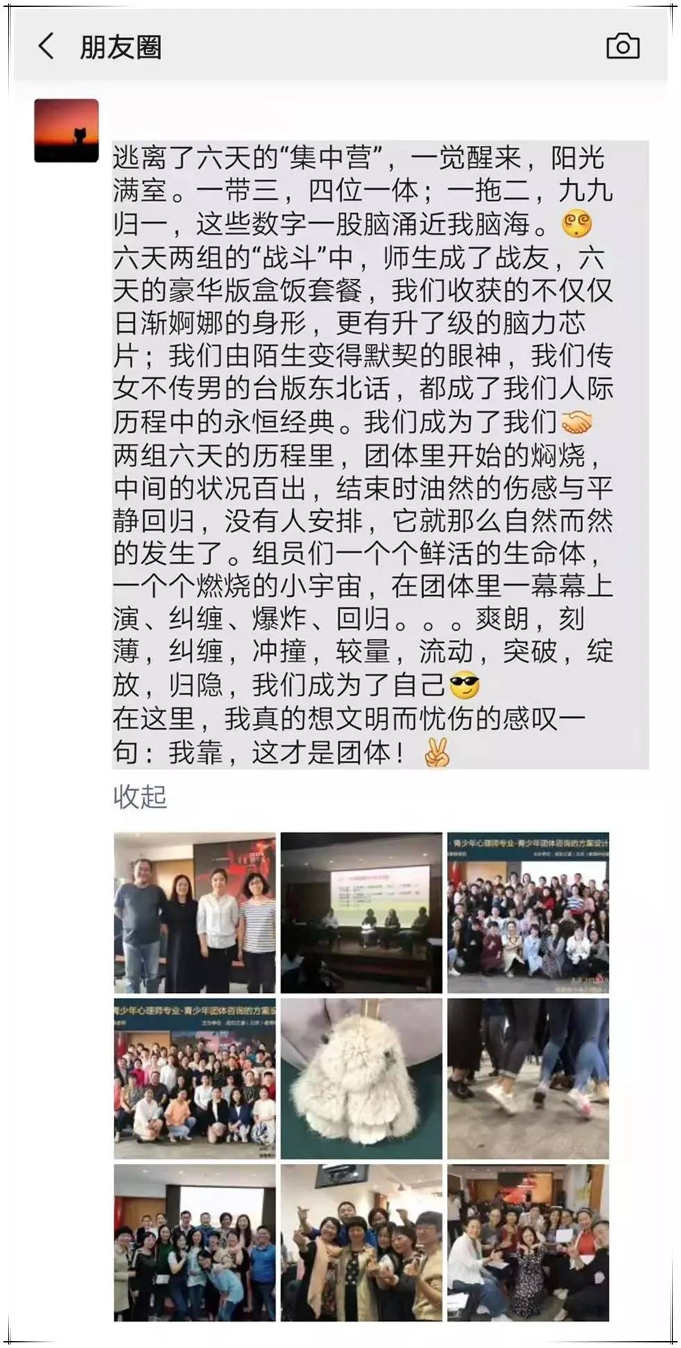 作为专业的课程工作人员,6天的时间作为旁观者观看着课堂中发生的一切,不得不赞叹团体展现出来的涵容的承载力以及丰沛的生命力,带给成员的改变与成长。谨通过此文来作为记录大家走过的一段难忘历程。