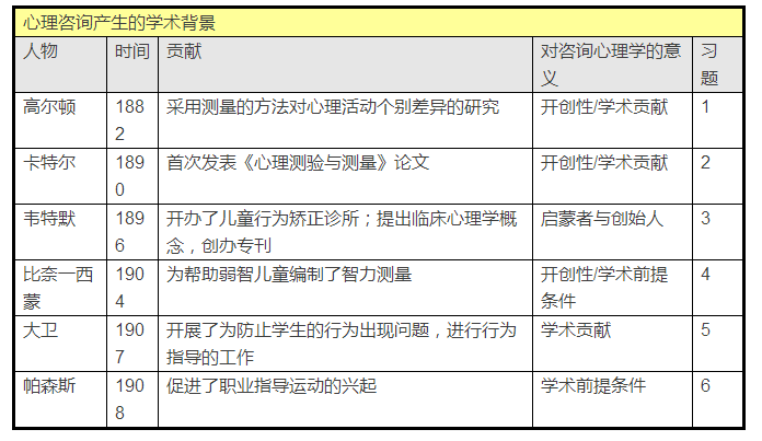 在咨询心理学形成之前,为咨询心理学准备了前提学术条件,做了开创性工作的是:①高尔顿;②卡特尔;③比奈一西蒙。