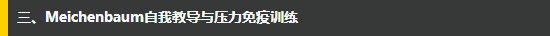 后来,Meichenbaum将自我教导训练发展为压力免疫训练用以处理一般人的压力与焦虑,压力免疫训练是综合教导、讨论、认知、重建、问题解决、放松训练以及增强自我教导等技巧的综合方案,训练中的重要关键在于采用示范,受试者被明白的告以考试焦虑乃由于自找负向思考和负向的自我陈述,而训练之目标即在以不兼容之正向内言挑战负向内言,以减低考试或某情境的焦虑。