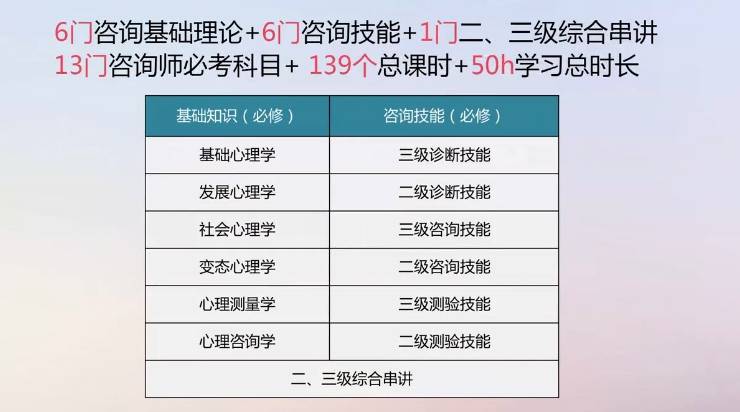 依据心理咨询师考试大纲要求,《心理咨询师二三级备考全套视频》设置了12个专项备考章节:基础心理学、发展心理学、社会心理学、变态心理学、心理测量学、二级诊断技能和三级诊断技能、二级咨询技能和三级咨询技能、二级测验技能和三级测验技能;以及1个综合串讲章节,总计139个正式的视频课时,总时长在50小时左右。