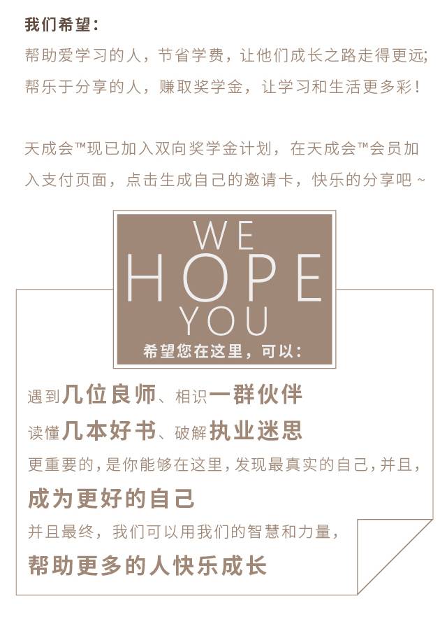3、【天天心理成长会员-专业会员】现已加入“双向奖学金”计划,邀请好友加入会员可赚得300元/人的奖学金,与此同时,接受好友邀请加入会员的朋友也可直接返还100元/人的奖学金。详情咨询客服微信15210329672(工作日10-18点在线)