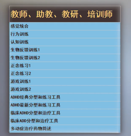2.应用基础:测评师+课程顾问:划销实验,舒尔特方格,感统测试,认知测试,行为测试,脑电测试123,ADHD临床诊断工具,ADD临床诊断工具-家长咨询,沟通中问到测评原理,长短板意味着什么,发展原理,其他没有用的工具-尝试过其他机构其他方法